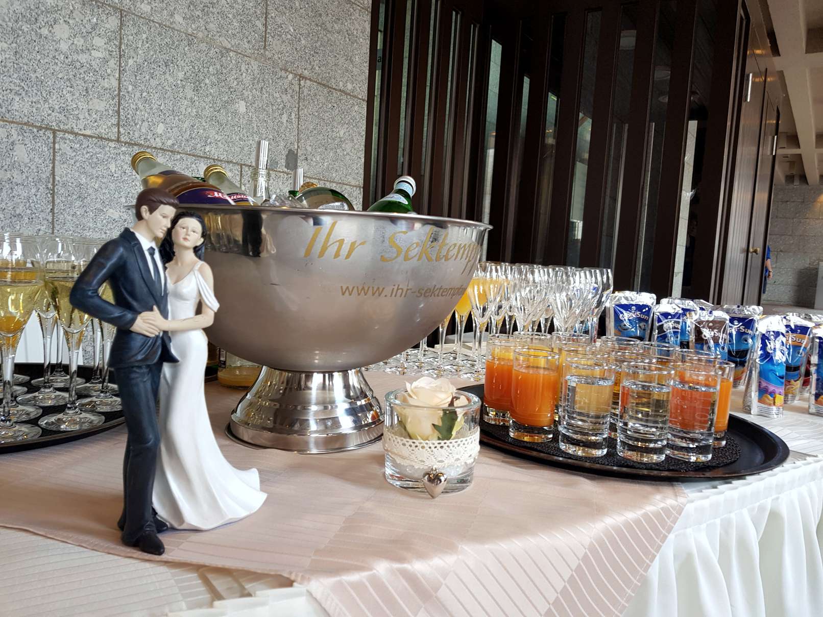 hier finden Sie alle notwendigen Informationen, um Ihre eigene Hochzeit, oder die eines lieben Verwandten oder Bekannten mit unserem Sektempfang-Service zu einem Ereignis zu machen. Gehen Sie keine Kompromisse ein, wenn es um einen der wichtigsten und schönsten Tage in Ihrem Leben geht: Bieten Sie sich selbst, dem Brautpaar und den anwesenden Gästen nach der Trauung einen Moment des entspannten Verweilens. Mit unserem Sektempfang gehen Sie auf Nummer sicher, dass die Getränke eisgekühlt sind, Sie nicht aus Plastikgläsern trinken müssen, entsprechendes Personal vorfinden und der Gesamteindruck überwältigt.